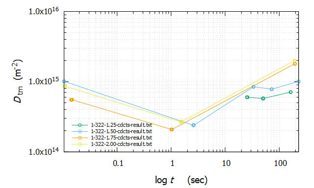 CDCTS(Charge and DischargeCurrent Transient Spectroscopy)は充電または放電における電荷の移動時間のピークからキャリアの特徴を推測します。測定系には上記のものに準ずる装置を用います。解析結果は下図のようなピーク時間と電荷密度の関係が得られます。ここでピークを示す固有の電荷があることを意味します。