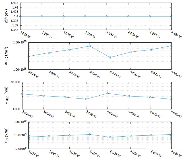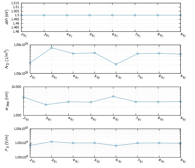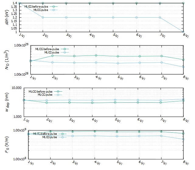 解析事例3はパルス電圧(50 V,10 msec)を印加した後とパルス電圧印加前のの界面物性を示します。ここで言えることは大半の試料においてショットキー障壁高さsbhが低下しています。そしてドナー濃度NDも小さくなっています。一方、試料1-Viは変化が見られませんでした。