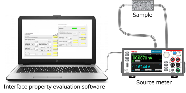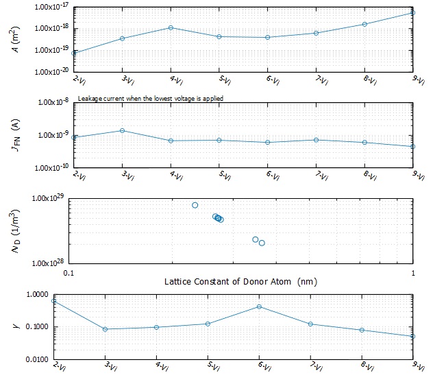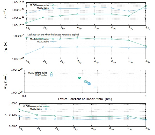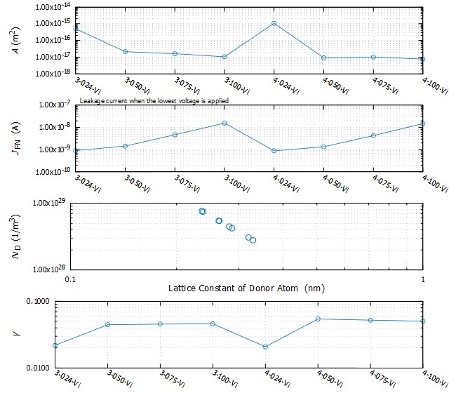 従来技術にはない全く新しい手法です。リーク電流と電圧の関係から界面とバルクを流れる電流を支配する物性を計算するものです。得られる物性は次の通りです。